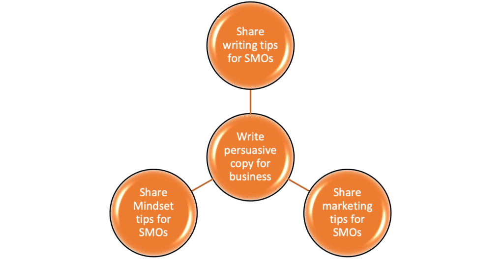 The next step is to get creative and generate ideas about how I can illustrate this core value in the content I publish. From there I can add a circle with Writing tips for SMO’s. Another circle with Marketing tips for SMO’s. Mindset tips for SMO’s.