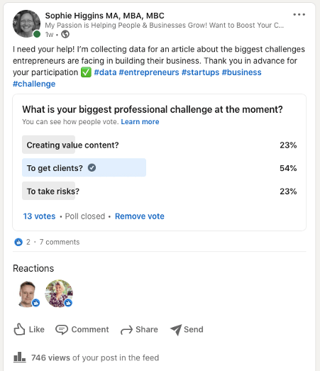 The next step was to create a poll on LinkedIn about the most significant challenges entrepreneurs face in building their businesses.