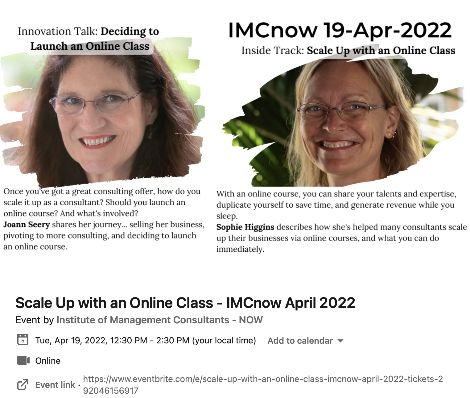 Joann Seery will be sharing her story on how she sold her business and pivoted into more consulting. And how she decided to launch her online course with the help of Sophie Higgins and her Online Creation Support Services.